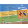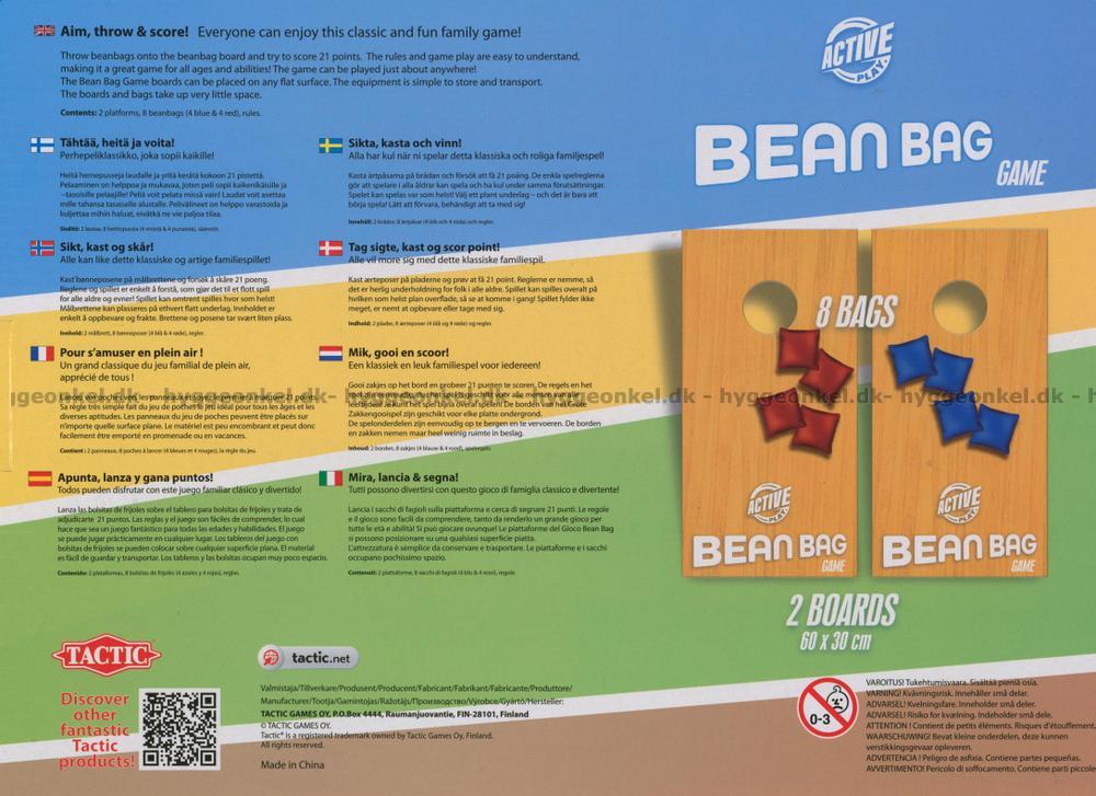 2 träbräden som mäter cirka 60 x 30 x 0,9 cm och 8 ärtpåsar (4 blå och 4 röda). Diametern på hålen är cirka 9,5 cm.