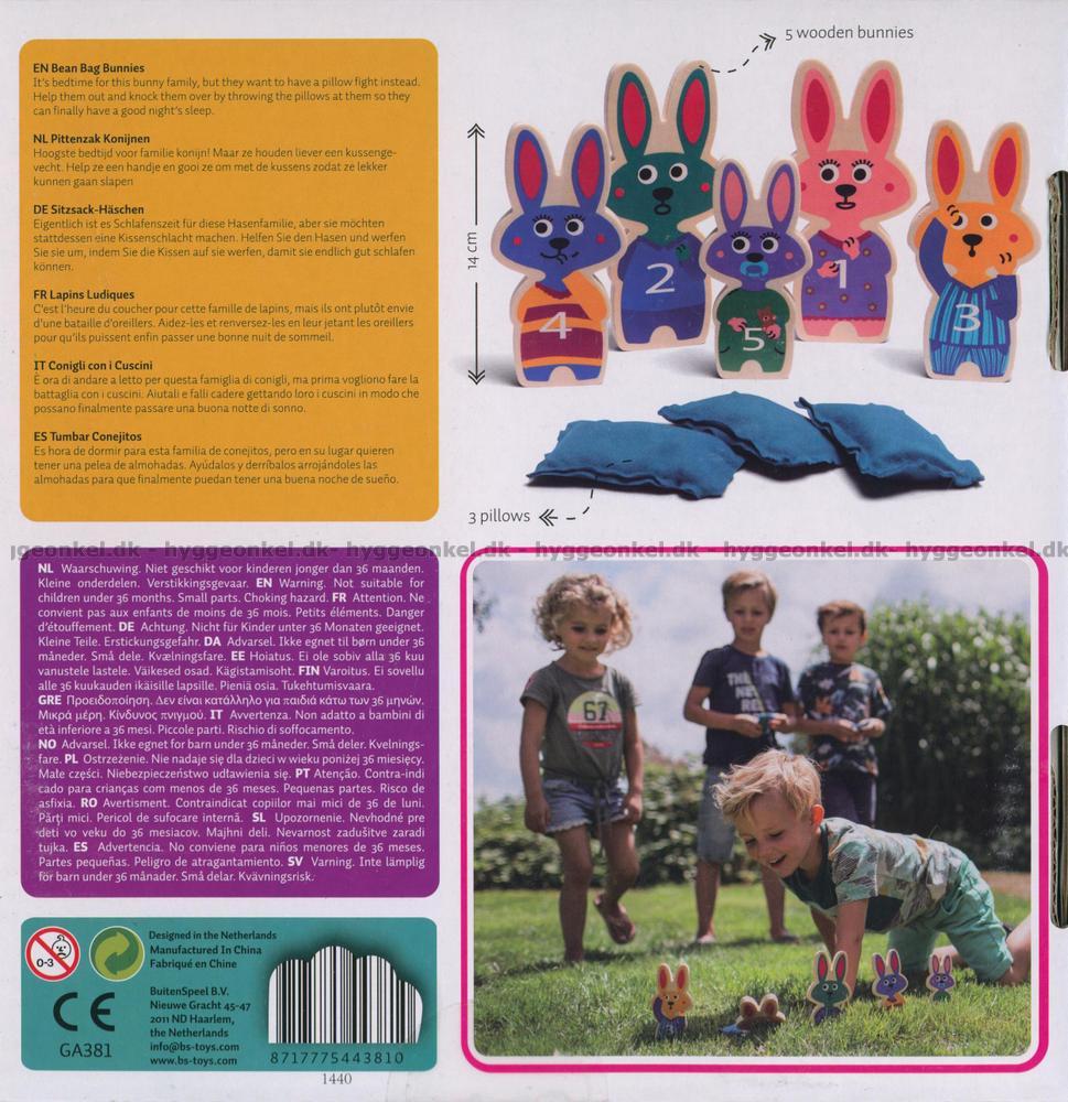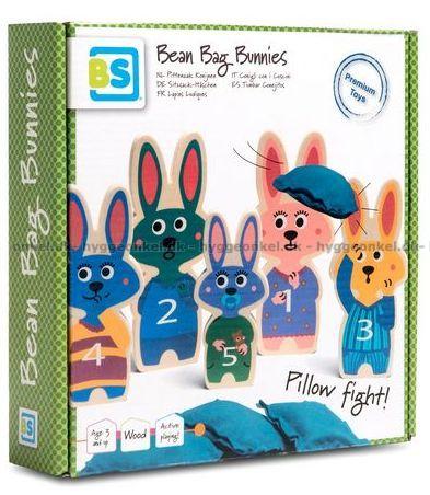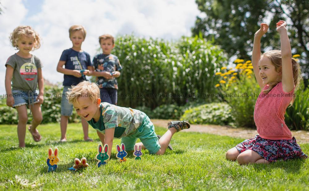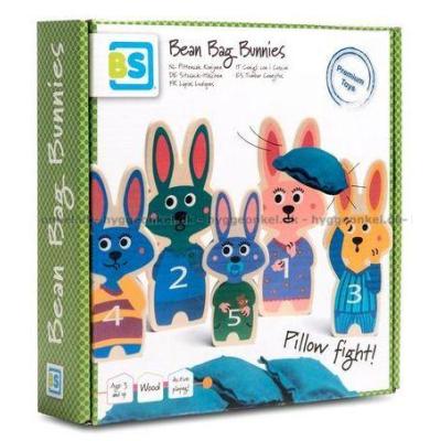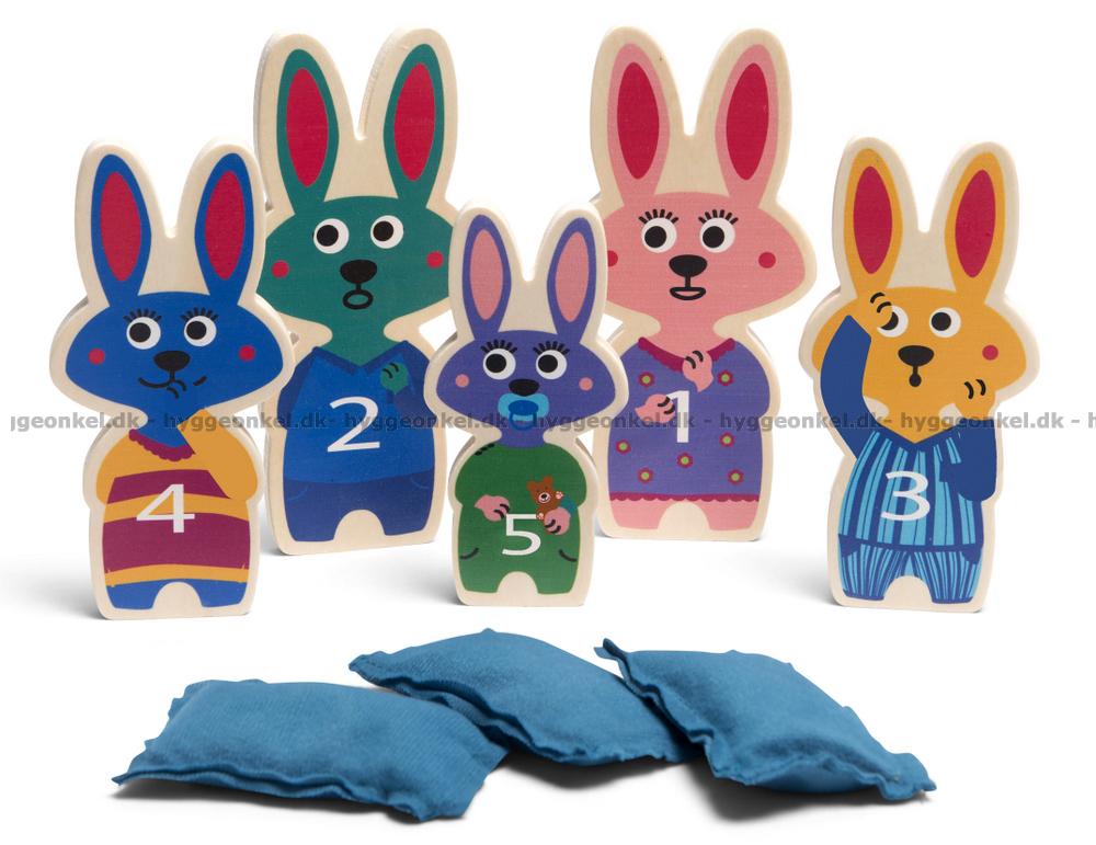 5 kaniner i trä (mellan 12 och 16 cm höga) och 3 ärtpåsar (8 x 5 cm).
