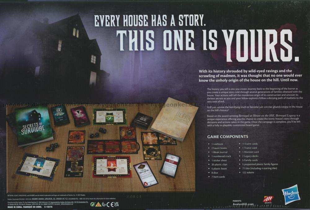Spelet baseras på det prisbelönta Betrayal at House on the Hill, och Betrayal Legacy är en unik upplevelse, där ni får chansen att skriva det ikoniska husets historia genom era handlingar och beslut. När kampanjen är över, har ni kvar ett spel som kan spelas många gånger och som ger er helt unika spelupplevelser.