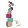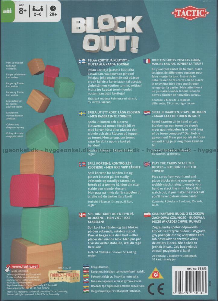 9 träklossar i 3 färger och 55 kort.