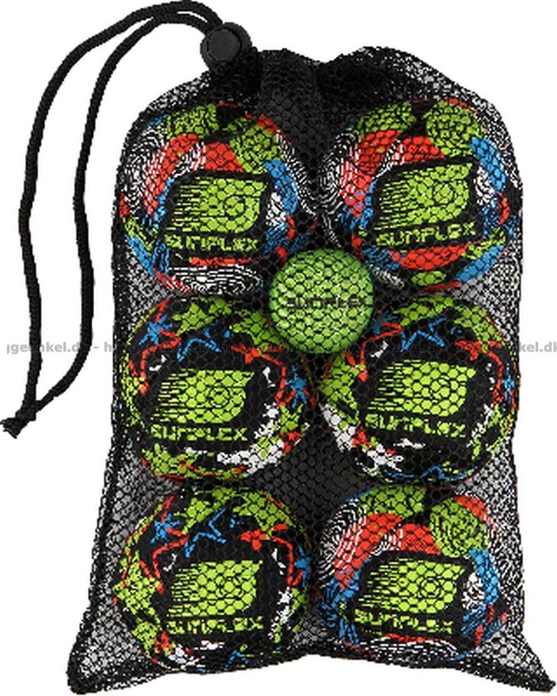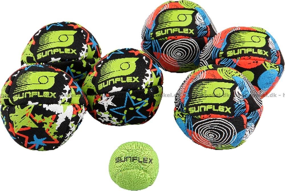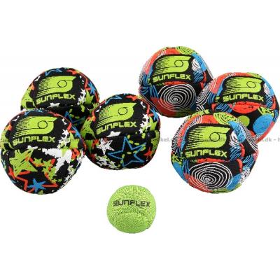 6 mjuka klot (i två olika färger) - varje klot har en diameter på 7 cm - 1 litet klot ("grisen"), som mäter 3 cm i diameter, och 1 förvaringspåse/transportpåse.