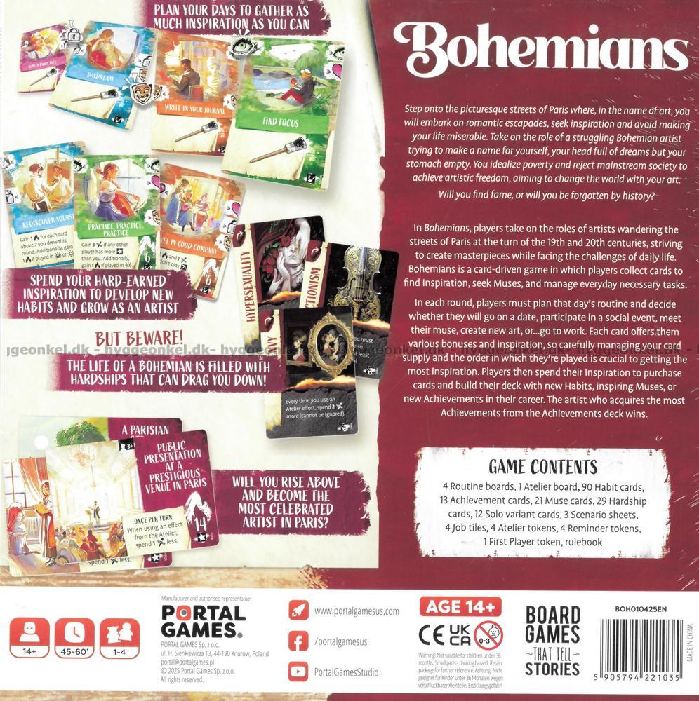 Bohemians är ett strategiskt och tematiskt kortspel där spelarna tävlar om att uppnå berömmelse genom att fullborda konstnärliga prestationer, kalla på muser och övervinna livets hårda realiteter. Spelet är djupt förankrat i berättelsen om det romantiska konstnärslivet i Paris – en plats fylld av frihet, kärlek, melankoli och skönhet. Varje runda är en berättelse i sig själv, och varje beslut ett penseldrag i ditt livsverk.