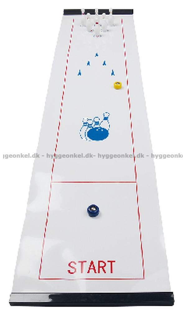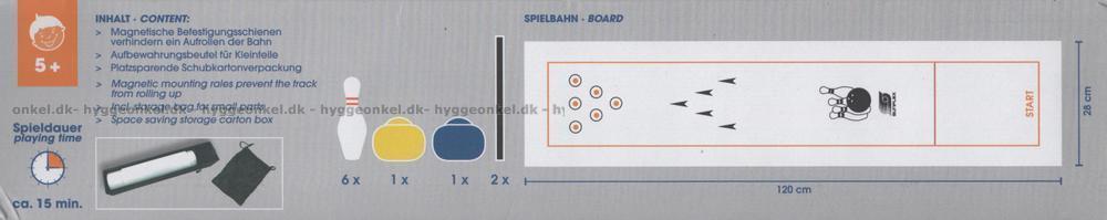I asken för spelet hittar du en "bowlingbana" som ska rullas ut. Den är 1,2 meter lång och 28 cm bred. Med ramar på kortsidorna hålls banan på plats.
