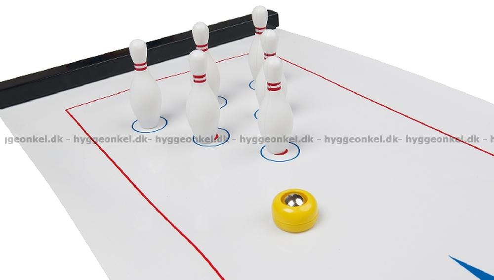 Fokusera. Sikta. Låt klotet glida iväg över bordet! Det närmar sig käglorna. Kan det träffa några?