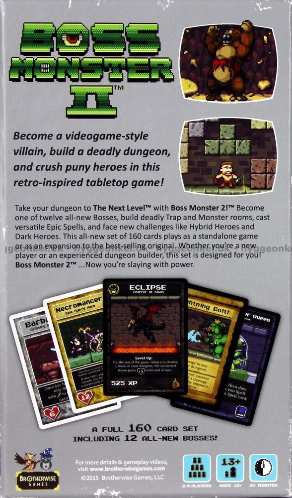 Ta din dungeon till nästa nivå (både bildligt och bokstavligt) med Boss Monster 2! Bli en av tolv helt nya bossar, bygg dödliga rum med fällor och monster, kasta episka besvärjelser och ta dig an nya utmaningar såsom Hybrid Heroes och Dark Heroes. Det här setet med 160 kort kan spelas fristående eller som en expansion till det bästsäljande originalet.