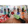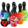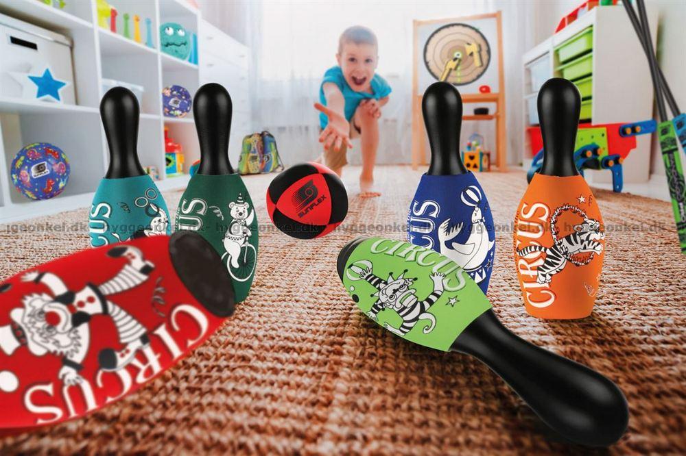 Här får du ett set med 6 färgglada cirkus käglor, som ska vältas omkull med den mjuka bollen.