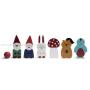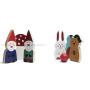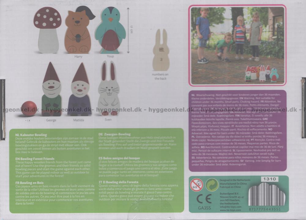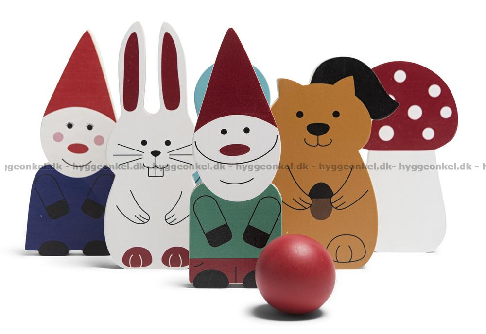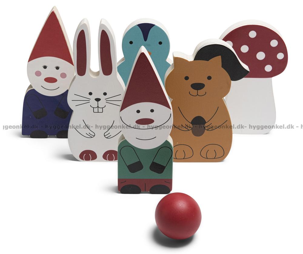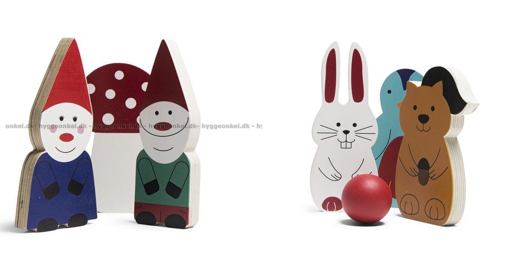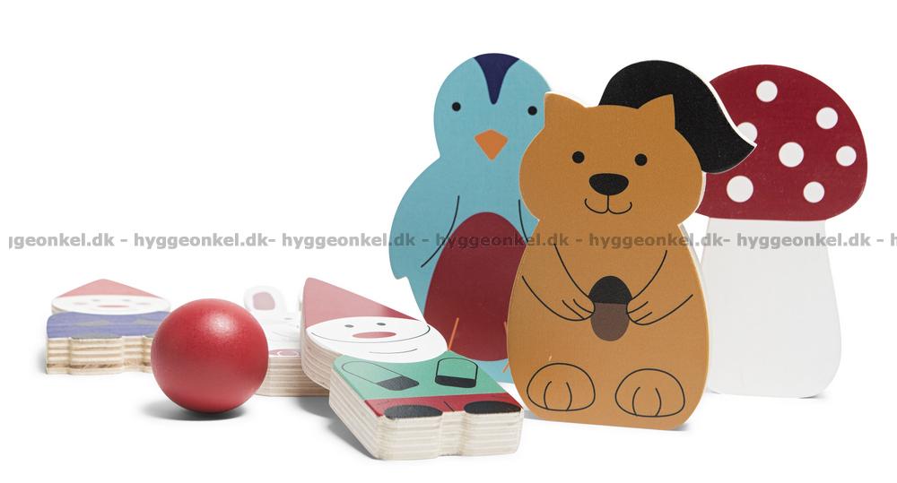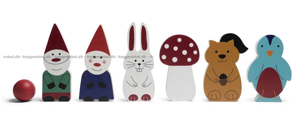 Här får barnen ett set med 6 käglor i trä som ska knuffas omkull med träbollen.