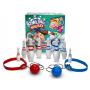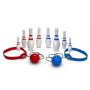 1 rött pannband med ett klot på en snodd, 4 röda bowlingkäglor i olika storlekar, 1 blått pannband med ett klot på en snodd och 4 blå bowlingkäglor i olika storlekar.