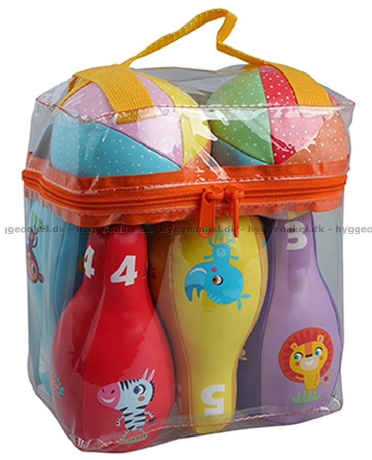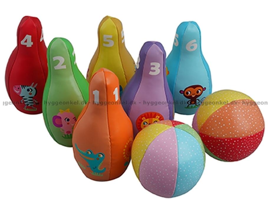 Här får du ett set med 6 färgglada djur, som ska vältas omkull med det mjuka klotet.