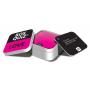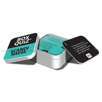 Här får du en metallask på cirka 6 x 6 cm med 50 kort, på vilka frågorna och svarsalternativen är på den ena sidan och svaren är på den andra.