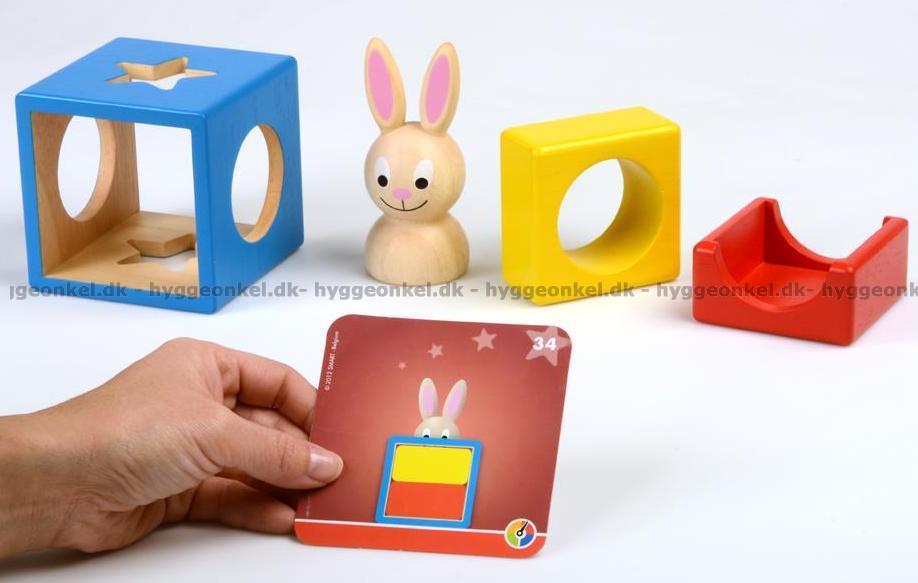 Man lägger fram ett kort med en utmaning. Sedan ska barnet försöka ställa upp figurerna på det sätt kortet visar. Det kan till exempel handla om att man endast ska kunna se kaninens huvud och den gula klossen. Barnet ska då placera kaninen i den gula klossen.