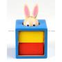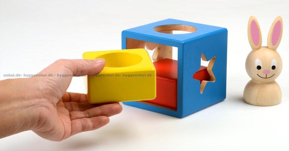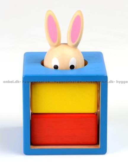 Den blå boxen mäter 9 x 9 x 9 cm - kaninen är 10 cm hög - den röda klossen är 7 x 7 x 3,5 cm - den gula klossen är 7,5 x 7,5 x 4 cm.