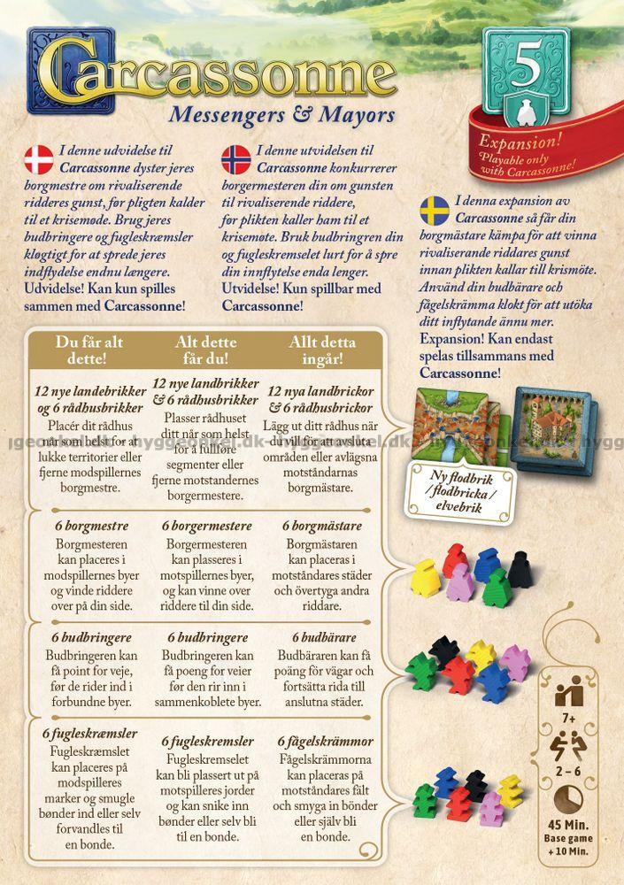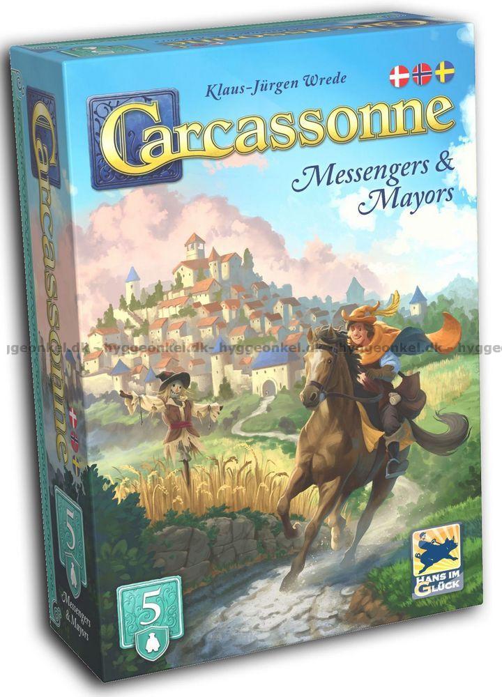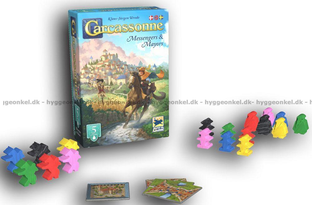 I Budbärare & Borgmästare får Carcassonne en frisk fläkt av strategi och rörelse. Expansionen introducerar tre nya figurer, som var och en ger dig nya sätt att påverka spelet på. Borgmästaren kan skapa inflytande i städerna och förändra maktbalansen, budbäraren rör sig från väg till väg, medan fågelskrämman ger dig möjlighet att forma fälten och förbereda dina nästa drag. Dessutom introducerar expansionen även rådhus, som ger spelarna fler taktiska överväganden.