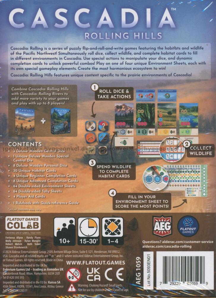 Cascadia: Rolling Hills är en del av en spännande serie utmanande flip-and-roll-and-write-spel som lyfter fram de unika livsmiljöerna och djurlivet i nordvästra Amerika. I detta spel slår alla spelare tärningarna samtidigt, samlar djurliv och fyller i habitatkort för att skapa olika miljöer i Cascadia. Genom att använda speciella handlingar kan man manipulera sina tärningar och med hjälp av vissa specialkort kan man låsa upp kraftfulla kombinationer.