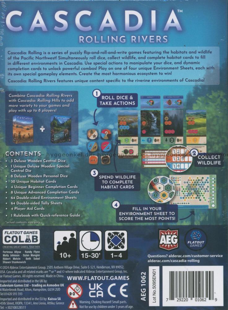 Cascadia: Rolling Rivers är en del av en spännande serie utmanande flip-and-roll-and-write-spel som lyfter fram de unika livsmiljöerna och djurlivet i nordvästra Amerika. I detta spel slår alla spelare tärningar samtidigt, samlar djurliv och fyller i habitatkort för att skapa olika miljöer i Cascadia. Genom att använda speciella handlingar kan man manipulera sina tärningar och med hjälp av vissa specialkort kan man låsa upp kraftfulla kombinationer.