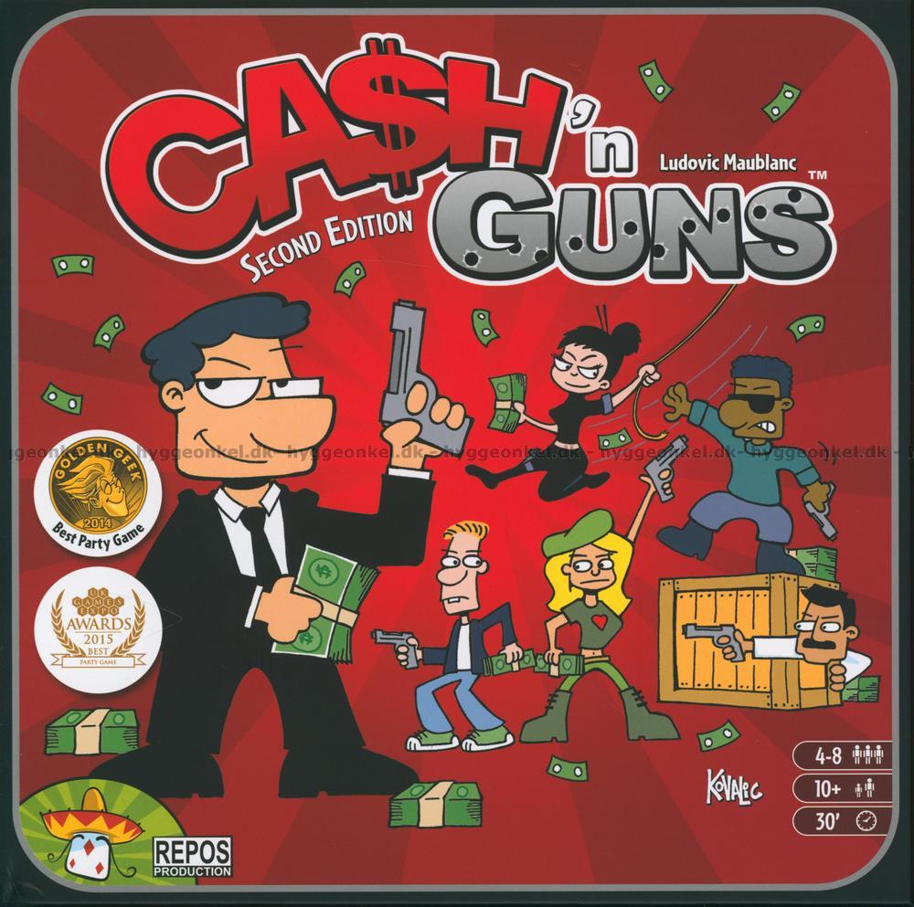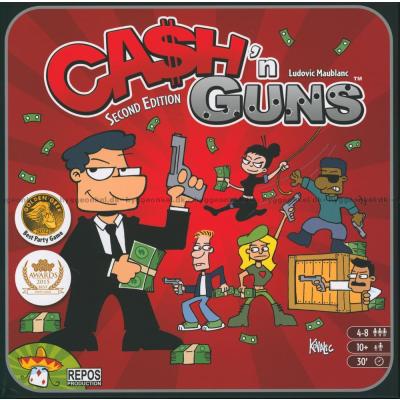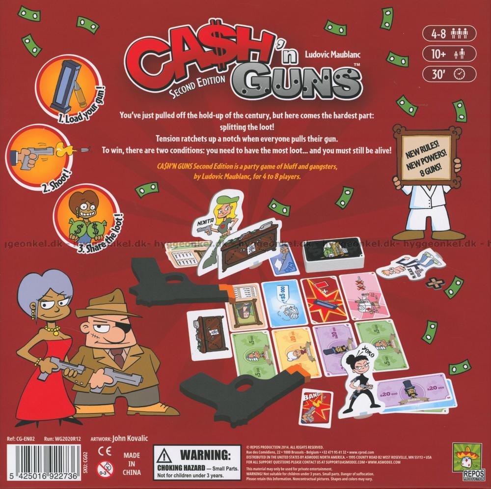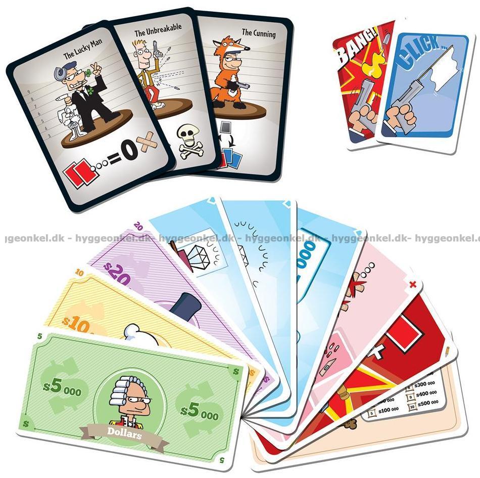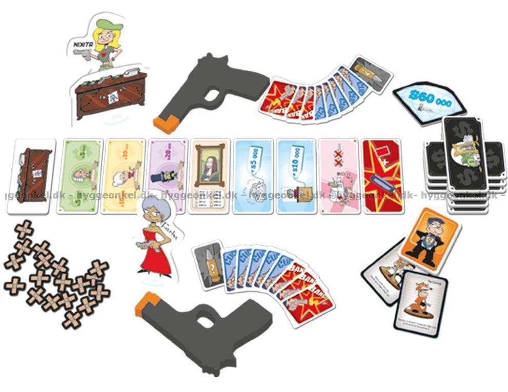 Kartongen innehåller kort, brickor, (engelska) spelregler och 8 pistoler.