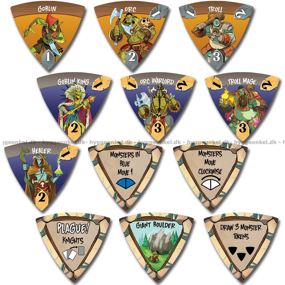 Spelet omfattar spelbräde, kort, monsterbrickor, pappväggar, torne inklusive hållare, 1 tärning samt spelregler (tyvärr bara på engelska).