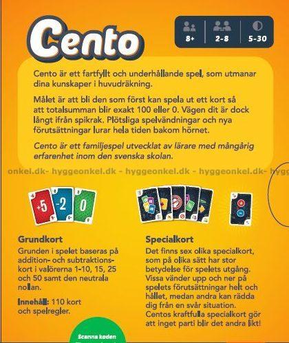 Cento är ett roligt och underhållande spel. Det är också lärorikt. Genom att spela tränar man automatiskt plus och minus och blir bättre på huvudräkning.