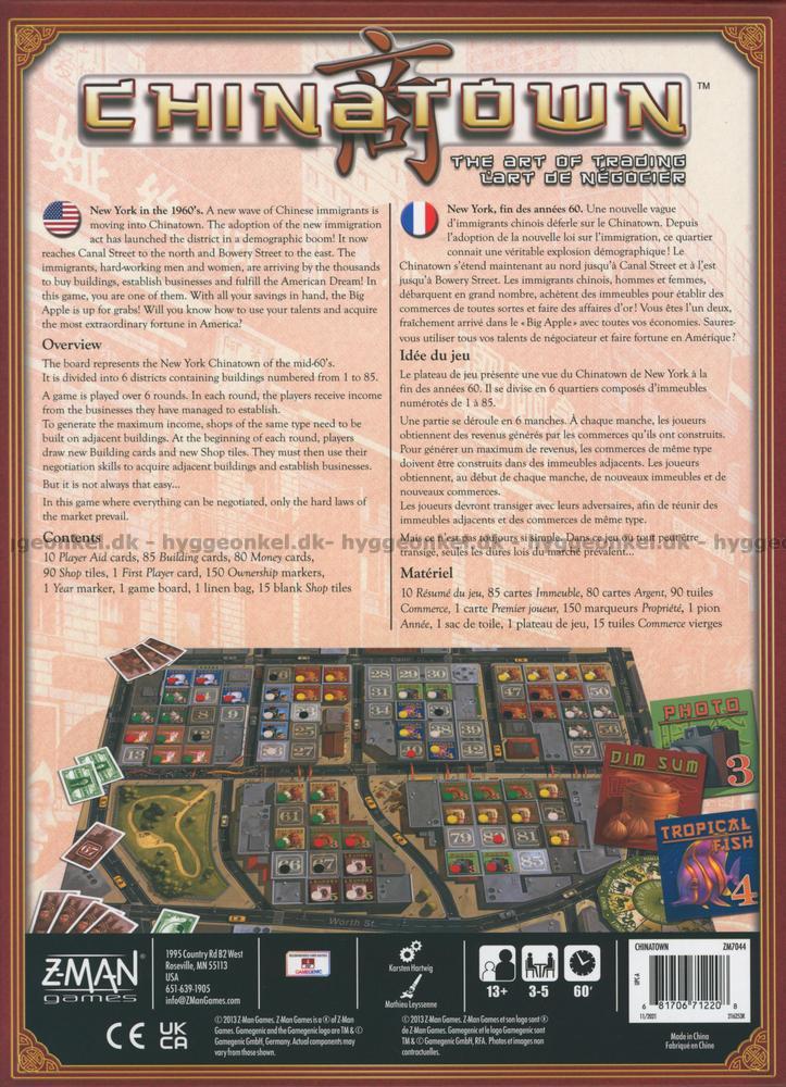 I strategispelet Chinatown får du nu chansen att utgöra en del av detta ekonomiska under. Du tar rollen som en immigrant och ska nu kämpa mot de andra för att få en stor portion av den amerikanska drömmen! Beväpnad med ditt sparkapital ska du köpa fastigheter och göra affärer så att du kan dra dig tillbaka som den främsta affärsmannen i Chinatown.