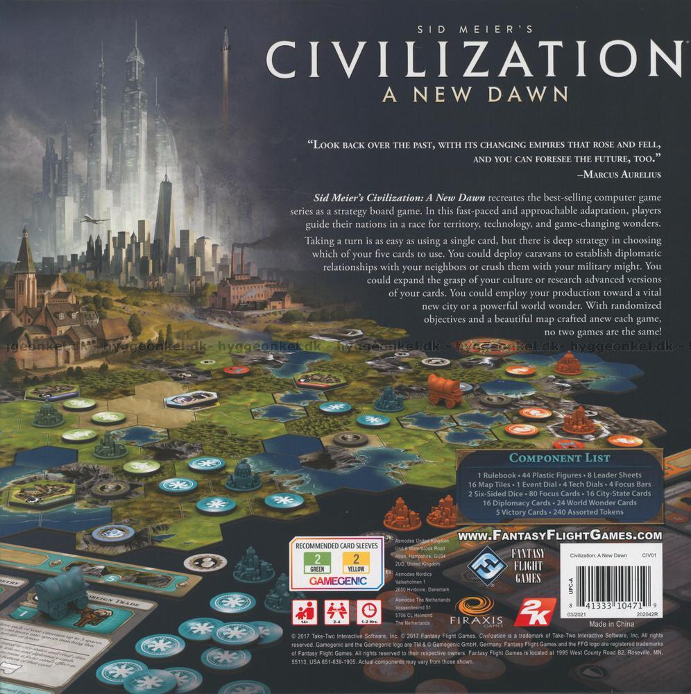 Sid Meier's Civilization: A New Dawn är ett strategiskt brädspel i vilket 2-4 spelare kontrollerar några av världshistoriens mest betydelsefulla civilisationer. Under spelets gång expanderar spelarna sina domäner, utvecklar ny teknik och bygger några av mänsklighetens mäktigaste under. När spelet avslutas kommer en av civilisationerna att höja sig över alla de andra.