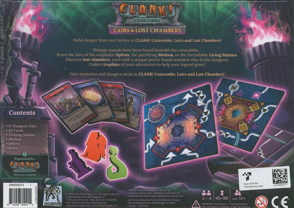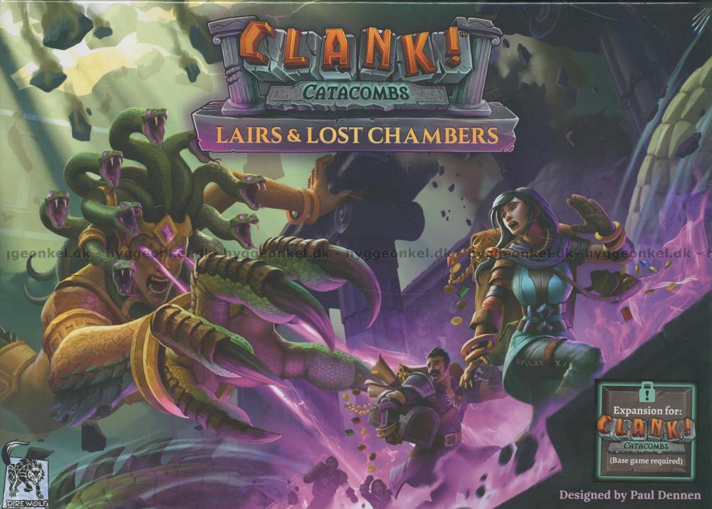 Ge dig ut på ännu djupare äventyr med Clank! Catacombs: Lairs & Lost Chambers. Denna expansion öppnar upp nya områden i katakomberna där dolda monster och farliga fällor väntar. Utforska de nya Lairs, där du kan utmana Sfinxen, Medusa och Levande Statyer för att vinna speciella troféer och bonusar som kan förändra spelets gång.
