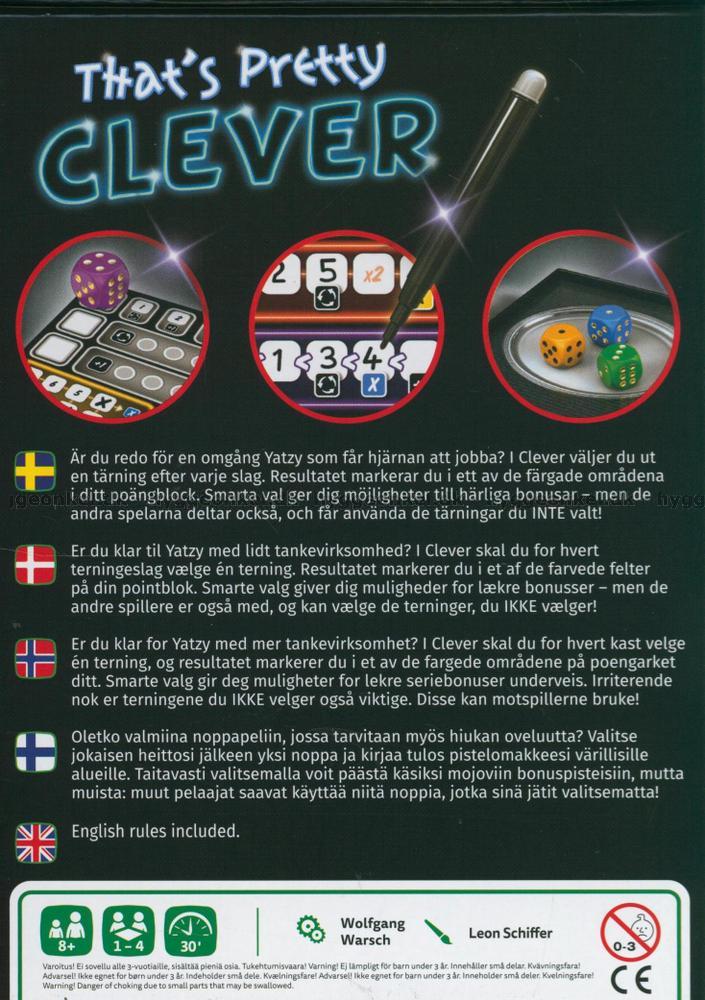Ganz schön clever är ett spännande tärningsspel i vilket alla deltagare är igång hela tiden. Du måste vara vaken - även när det inte är din tur att kasta tärningarna!