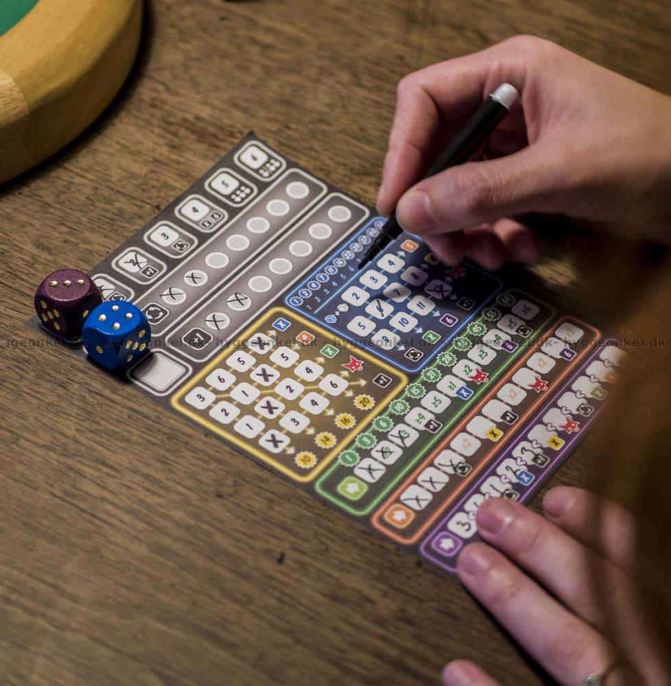 När det är din tur ska du kasta de 6 färgade tärningarna, som färgmässigt motsvarar färgerna på poängkortet, samt en vit tärning, som är lite av en joker. Den vita tärningen kan du använda som ersättning för gul, grön, orange eller lila tärning. Du kan också använda den vita tärningen i kombination med den blå för att få en högre poängsumma i det blå fältet.