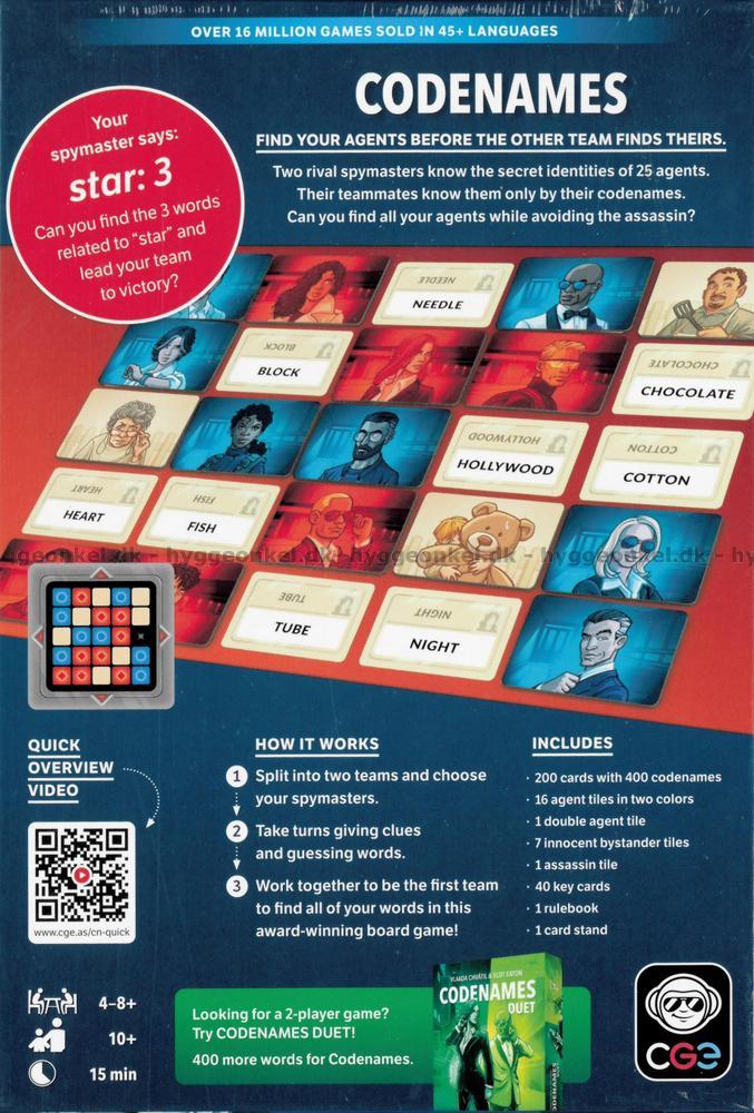 I kortspelet Codenames tävlar två lag om att bli först med att kontakta alla de egna agenterna. Spioncheferna ger ledtrådar som består av enstaka ord, som kan peka på flera ord som ligger på bordet. Deras lagkamrater ska försöka gissa ord i rätt färg, medan de samtidigt försöker undvika de kort som tillhör det andra laget. Dessutom måste alla försöka undvika lönnmördaren!