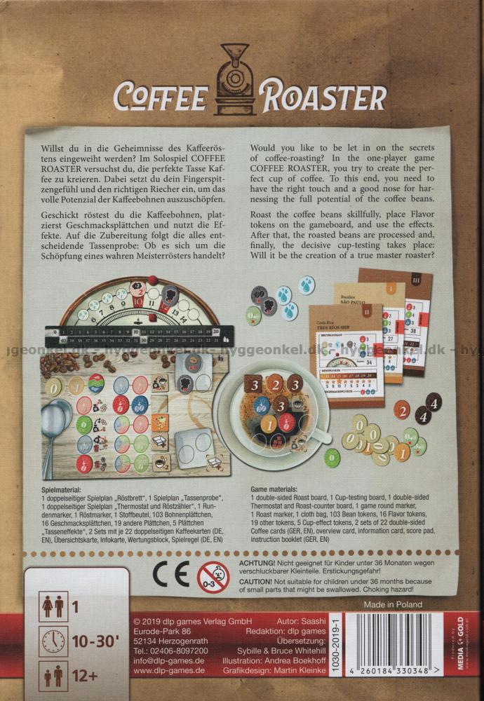 Asken för Coffee Roaster innehåller: 3 spelbrädor, 2 spelmarker, 1 rulle polletter, 22 kaffekort, 2 översiktskort, 1 poängblock och 1 tygpåse.