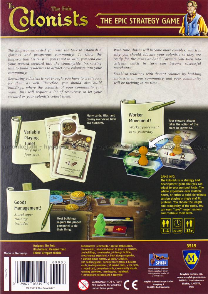 The Colonists är designat så att det finns olika svårighetsgrader och scenarier. Det finns också ett slags inlärningsscenario för nybörjare. Speltiden är på mellan 30 minuter (för nybörjare) till 180 minuter (för experter).