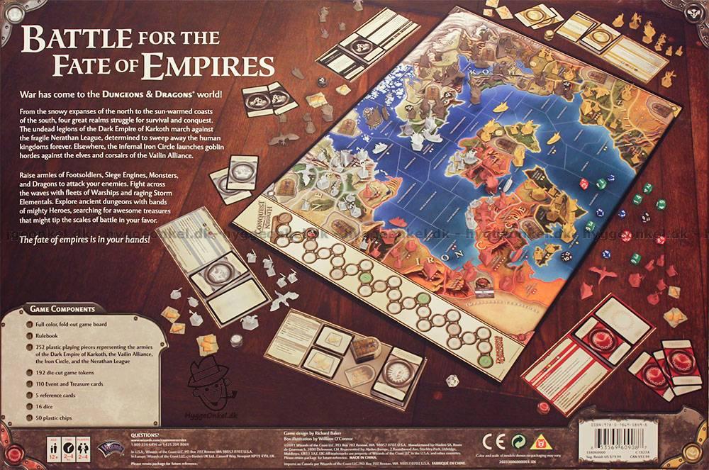 I kartongen döljer sig ett stort spelbräde, ett häfte med spelregler (på engelska), 252 figurer, 192 marker, 110 kort, 5 referenskort, 16 tärningar samt 50 chips.