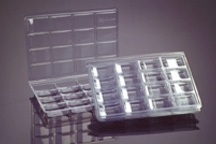 Asken innehåller 16 fack. Alla fack mäter ungefär 6 x 4 cm och är cirka 1 cm djupa. Lock och botten sitter ihop.