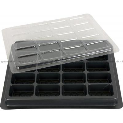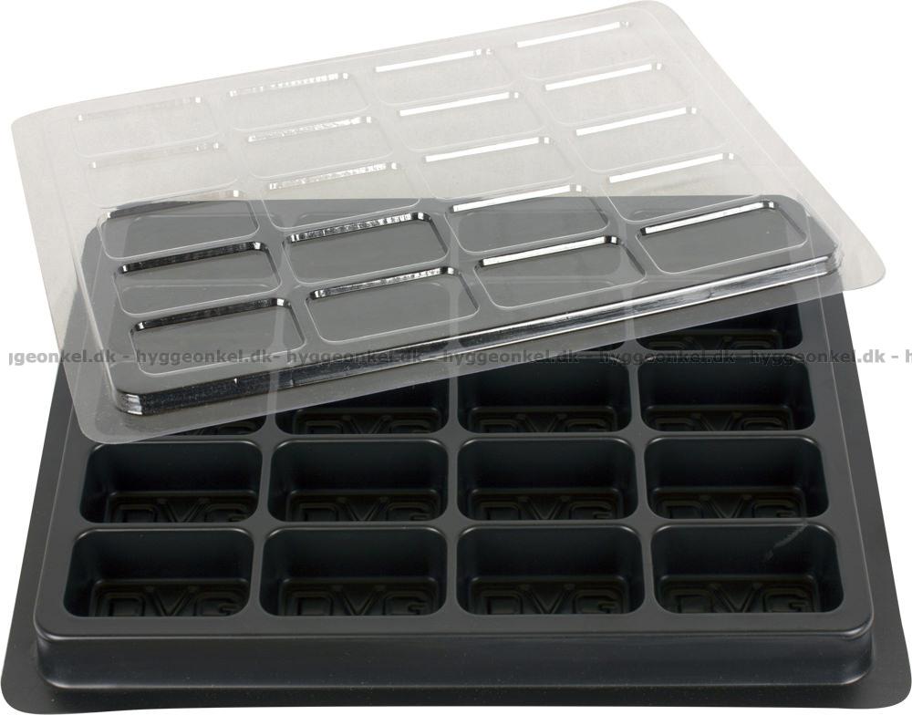 I lådan hittar du 20 fack. De mäter alla cirka 5,5 x 3 cm och är cirka 2 cm djupa. Ett lock i genomskinlig plast medföljer.