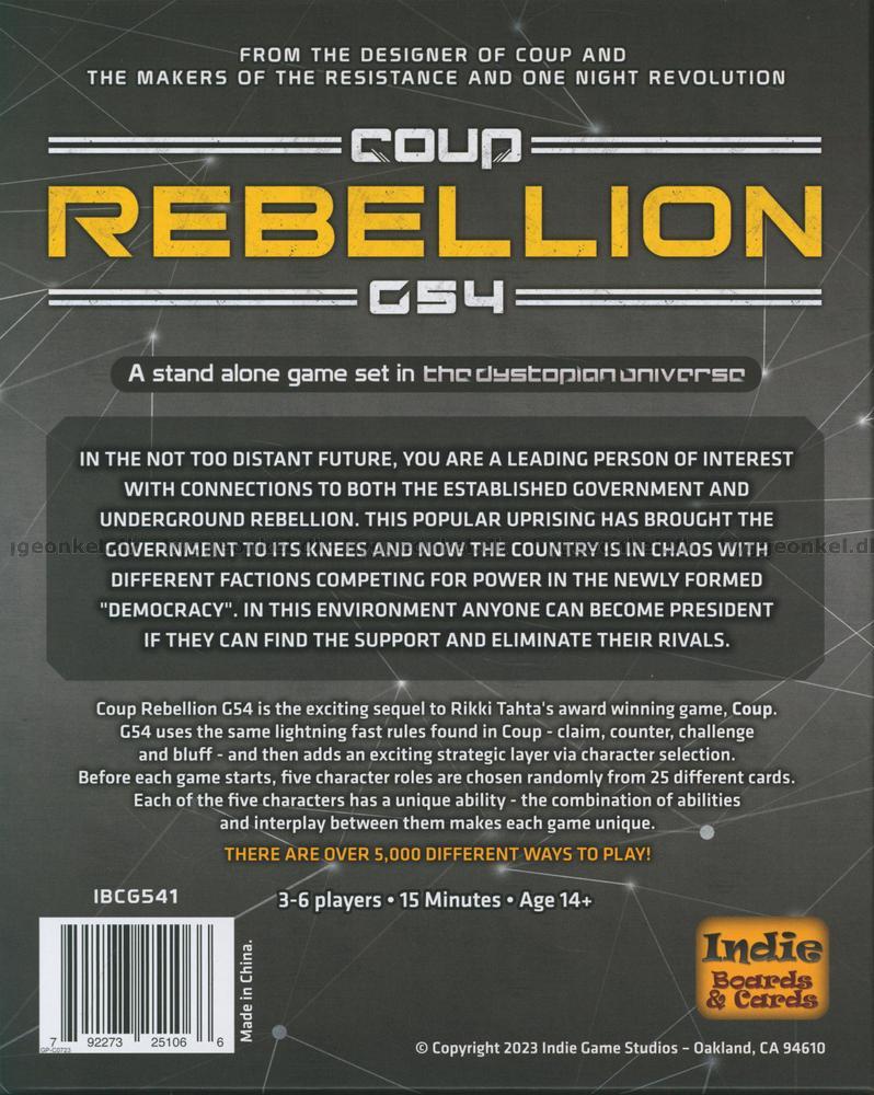 I Coup: Rebellion G54 vinner den spelare som när spelet avslutas är den enda som har "inflytande".