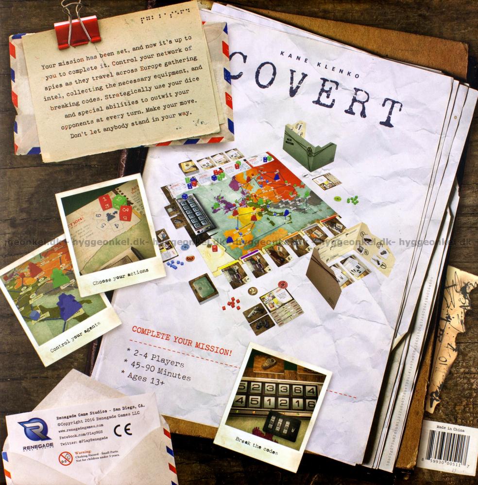 Kontrollera ditt nätverk av spioner, samla in upplysningar och knäck koder i spelet Covert. Här ska du placera dina tärningar strategiskt, använda dina förmågor på rätt sätt och tima dina handlingar perfekt under det kalla kriget i Europa. Spelarna kämpar om att genomföra riskabla uppdrag genom att skicka ut sina agenter och skaffa rätt utrustning samtidigt som de håller ett öga på kommande uppdrag och de planer som deras rivaler smider.