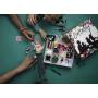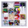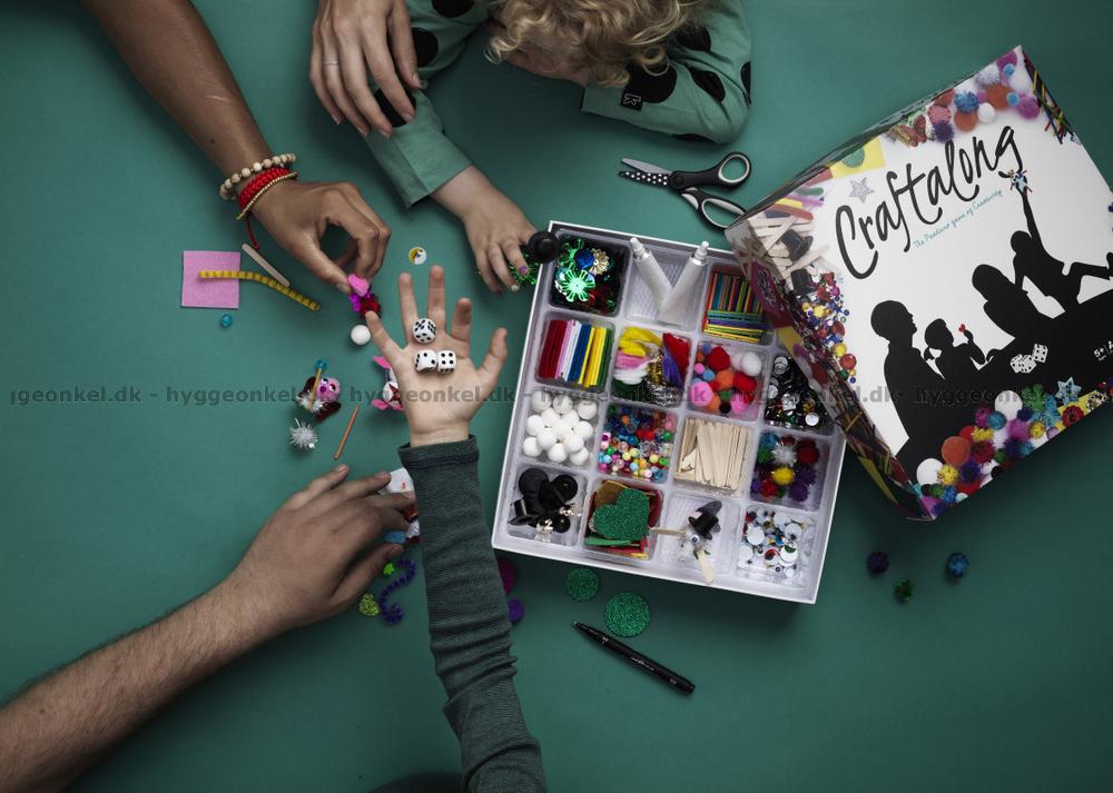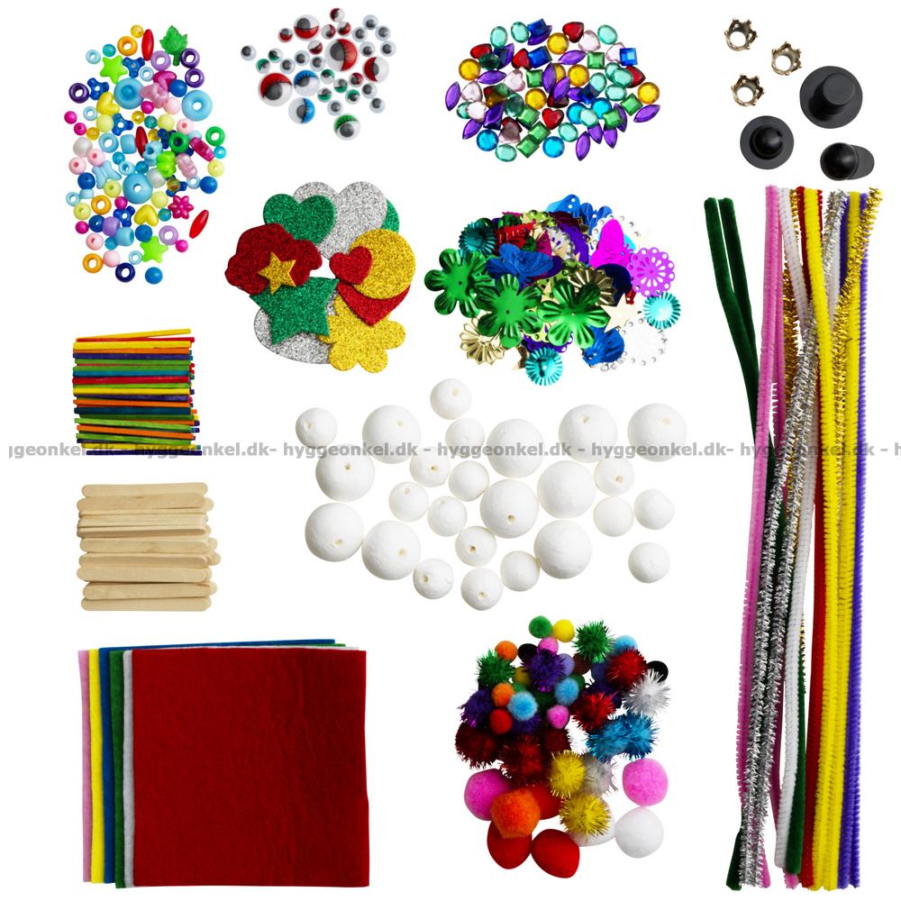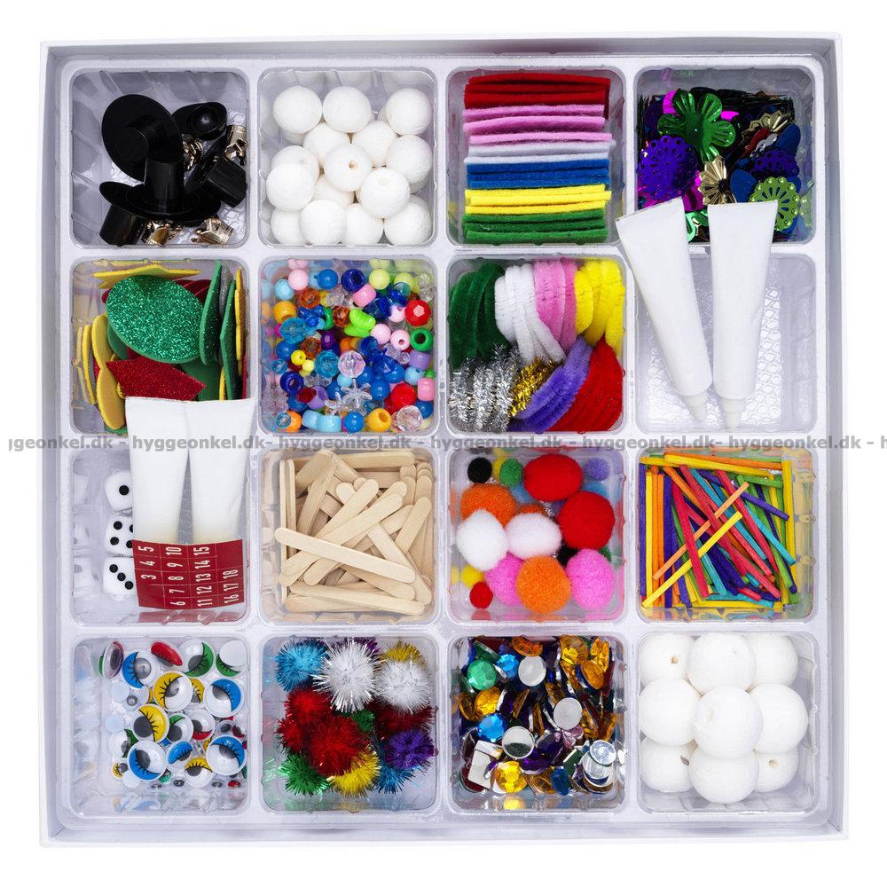 En lång rad material att använda för att skapa figurer samt 4 tärningar.