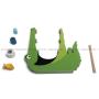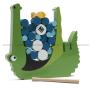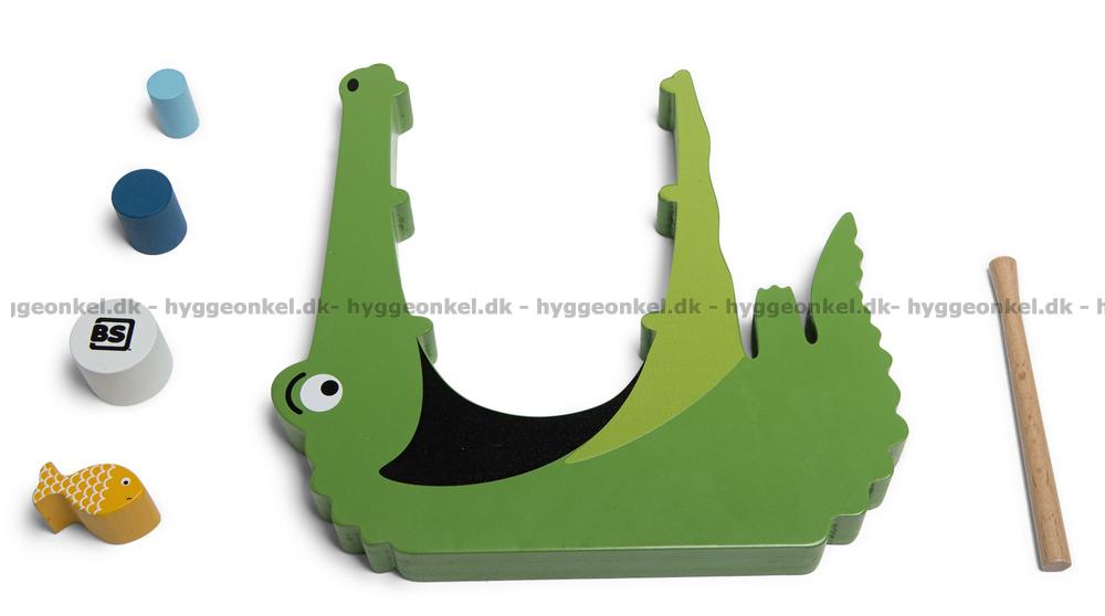 Krokodil i trä (mäter 20 x 22 cm), 18 bitar i olika storlekar, 1 fisk och 1 pinne.