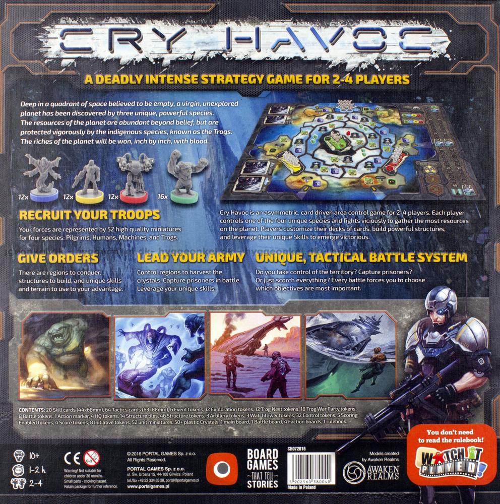 Cry Havoc är ett asymmetriskt, kort-baserat area control-spel för 2-4 spelare. Varje spelare har sin egen unika ras med speciella förmågor och svagheter och spelarna ska kämpa obevekligt för att få tag på det mesta av planetens resurser. För att lyckas med uppgiften måste spelarna göra modifieringar av sina decks, bygga strukturer med mäktiga egenskaper och utnyttja sina rasers styrkor.