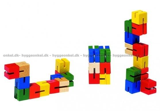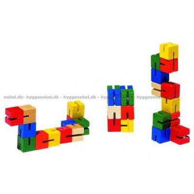 12 färgglada kuber i trä som sitter ihop med ett elastiskt snöre.