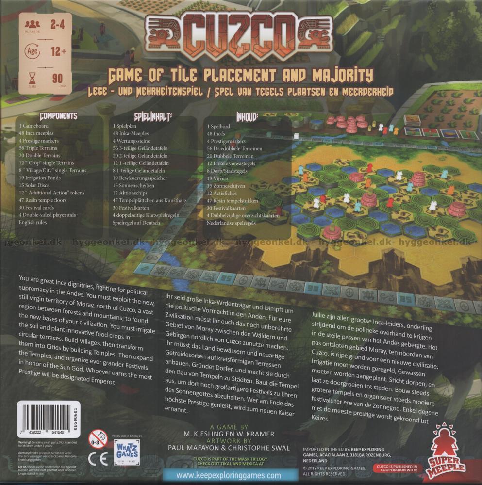 Cuzco är en ny version av Java, som är det andra spelet i Maske-trilogin designad av Michael Kiesling och Wolfgang Kramer och ursprungligen lanserat år 2000. Nu är spelet tillbaka med de andra två spelen i serien och den här gången får vi med läckra 3D-brickor!