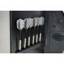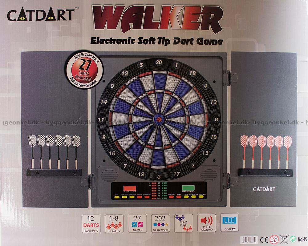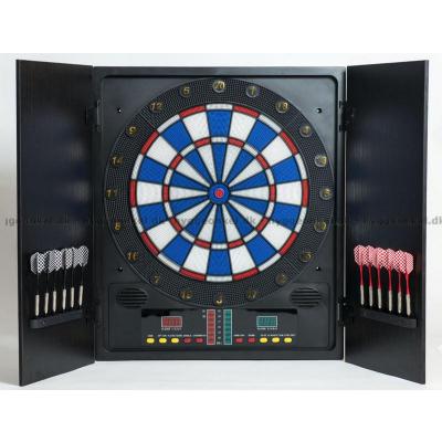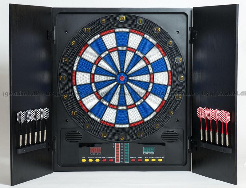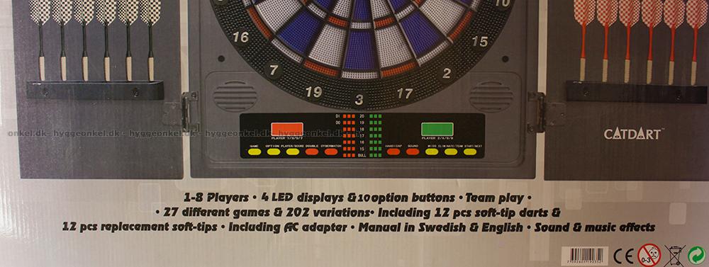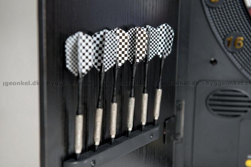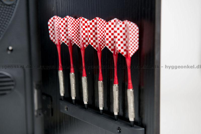 Spelet är komplett med skåp (i mörk träimitation), 1 darttavla (elektronisk) och 2 set med pilar.