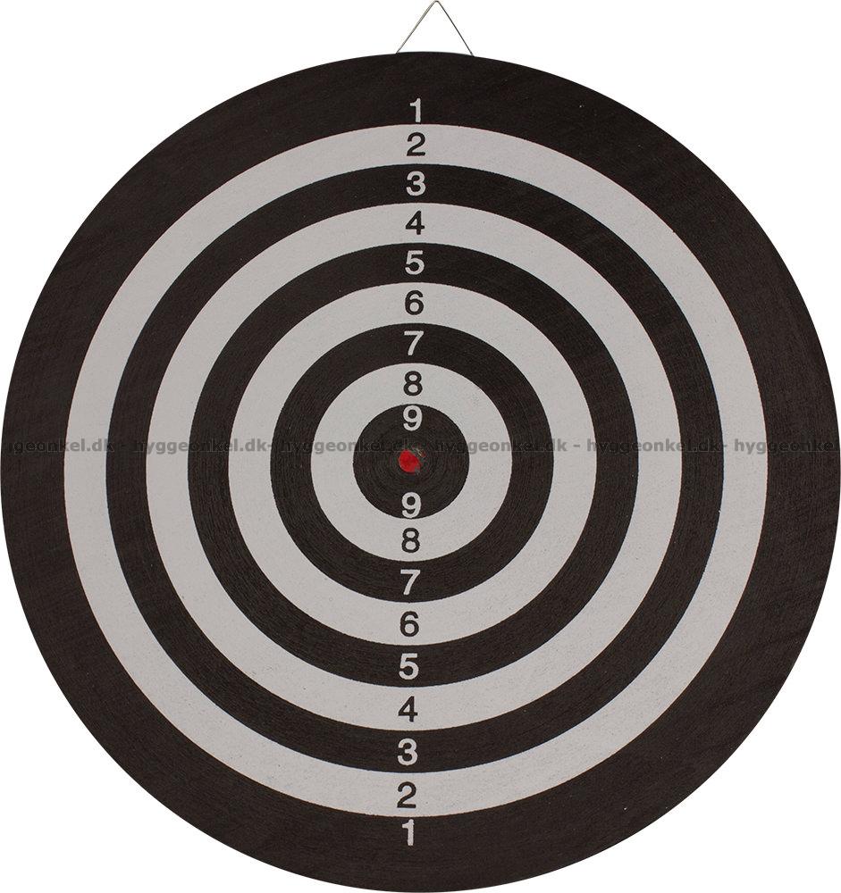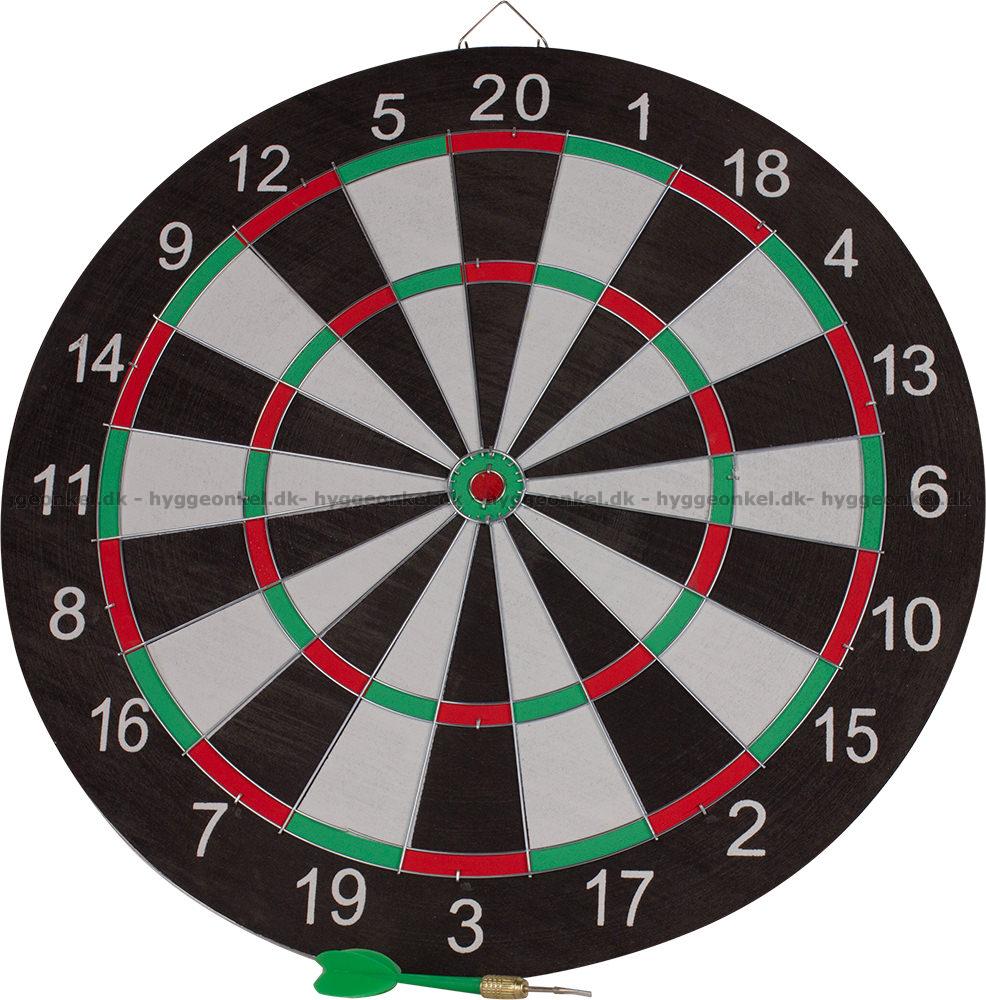 1 dubbelsidig darttavla. Tavlan har en diameter på 43 cm och en tjocklek på 1 cm.