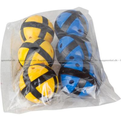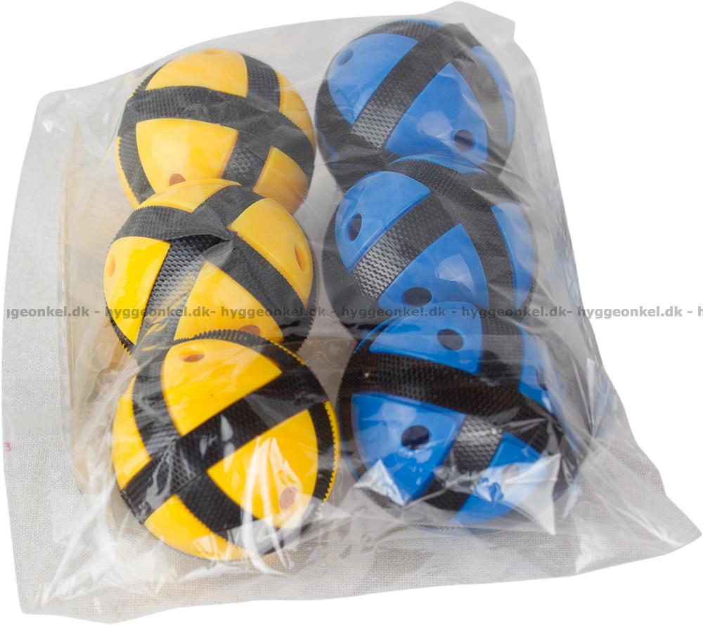 Du får tre blå och tre gula bollar med kardborre. Varje boll mäter cirka 3,5 cm i diameter.