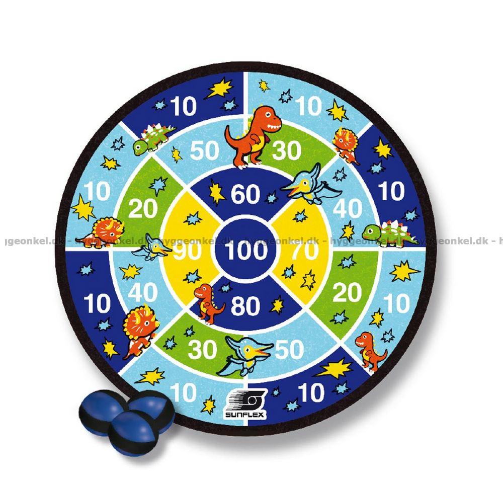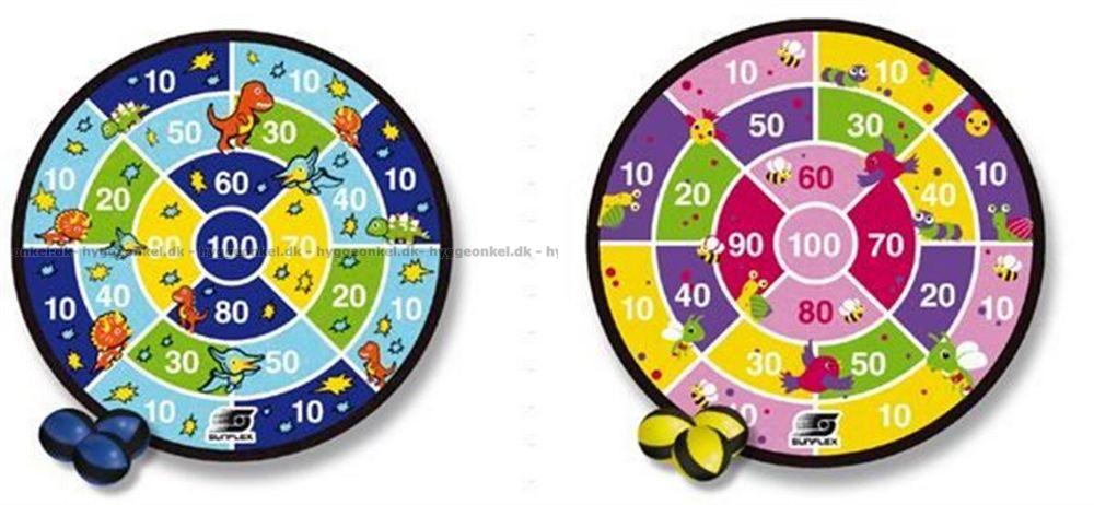 Dartskivan är vändbar. På den ena sidan hittar du dinosaurier - på den andra finns insekter och fåglar.