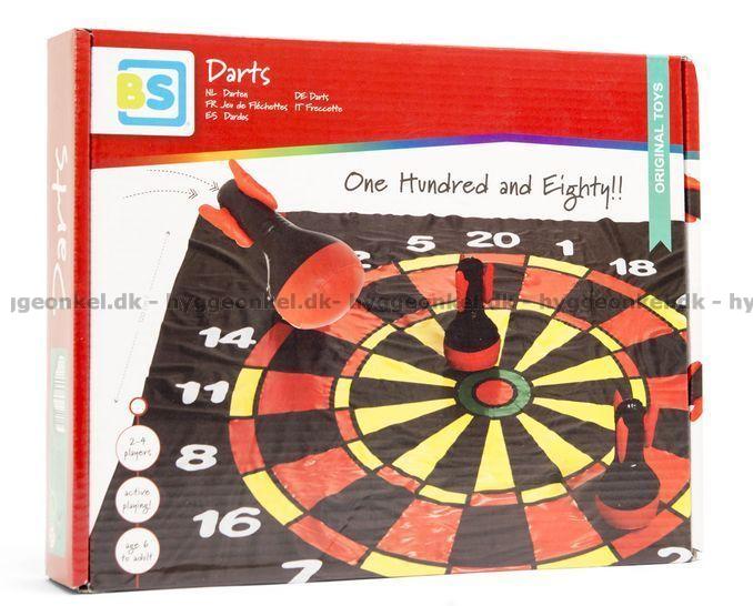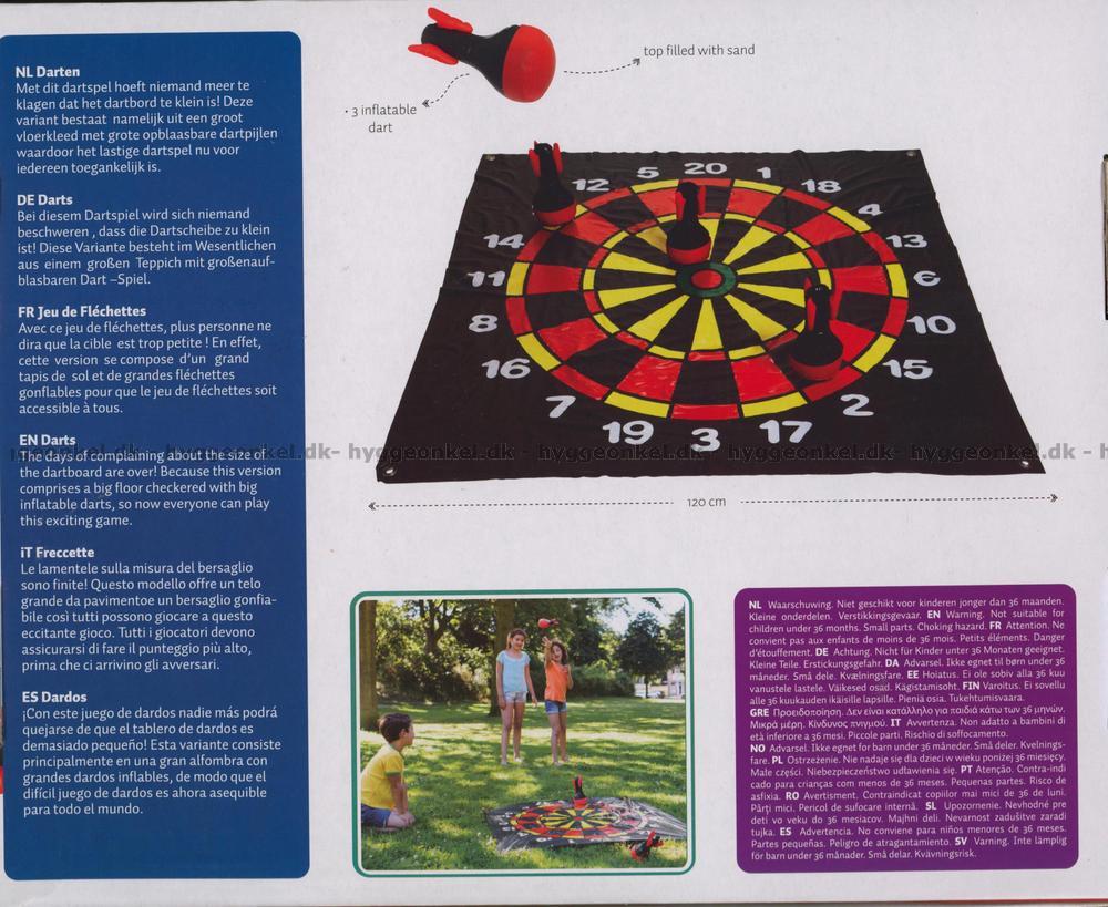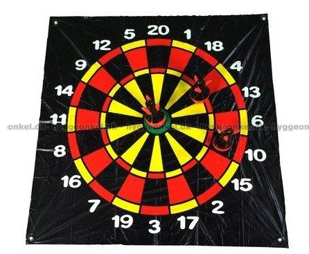 1 stor darttavla i plast. Den kan vikas ihop när den inte används. Tavlan mäter 120 x 120 cm när den har vikts ut.