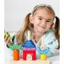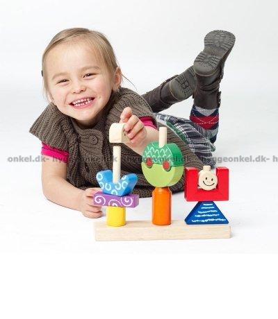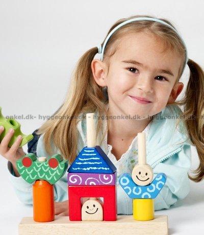 Det medföljer 10 färgglada träfigurer - de minsta mäter 3 x 3 x 2 cm.