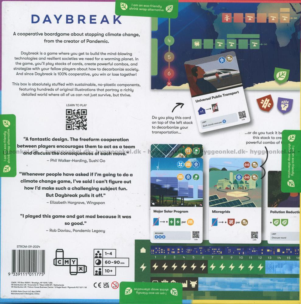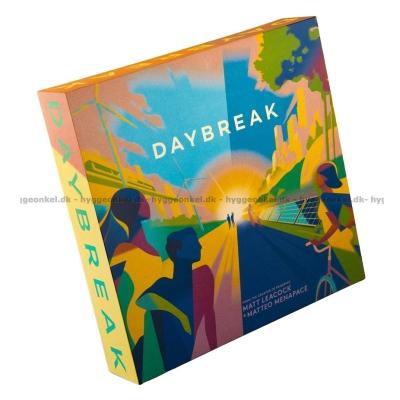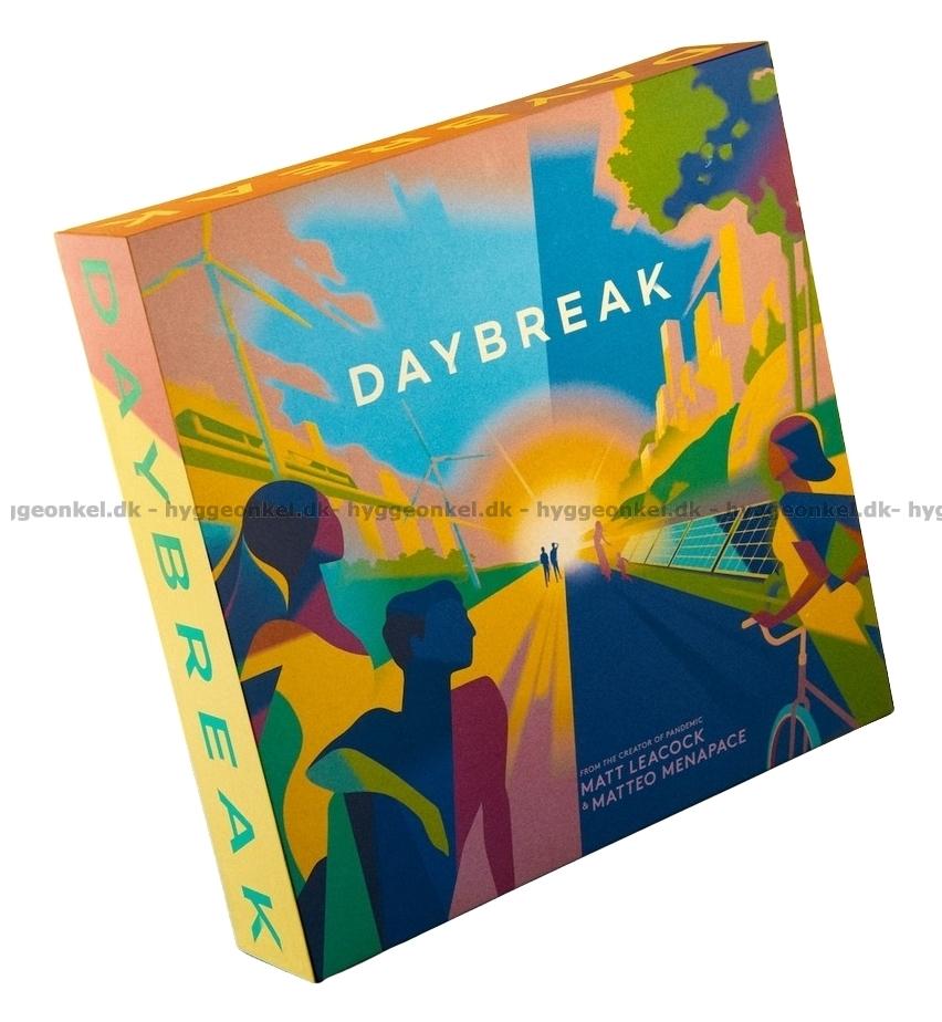 "Daybreak" är ett samarbetsspel designat av Matt Leacock, som är skaparen av det populära spelet "Pandemic". Spelarna ska samarbeta för att stoppa klimatförändringarna. Det är inte bara ett spel; det är en resa in i en värld där banbrytande teknik och motståndskraftiga samhällen byggs för att rädda planeten.