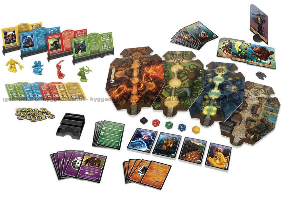 Spelområden, kort, spelpjäser, marker och tärningar.