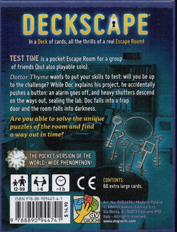 Deckscape: Test Time är det första spelet i en serie av samarbetsspel inspirerade av riktiga "escape rooms" i vilka en grupp spelare är fångade i ett rum fullt av gåtor och märkliga saker.