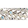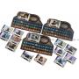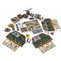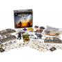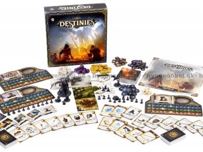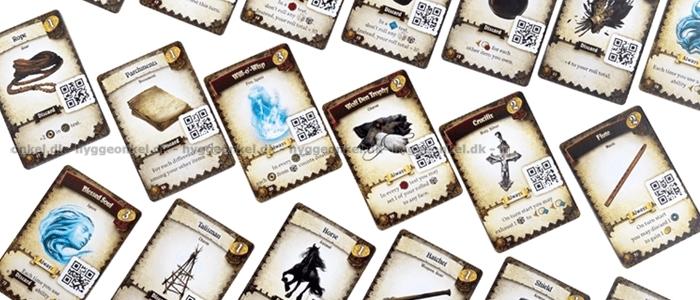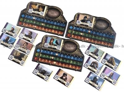 Individuella spelplattor, miniatyrfigurer i plast, kort, kuber och brickor i kartong.